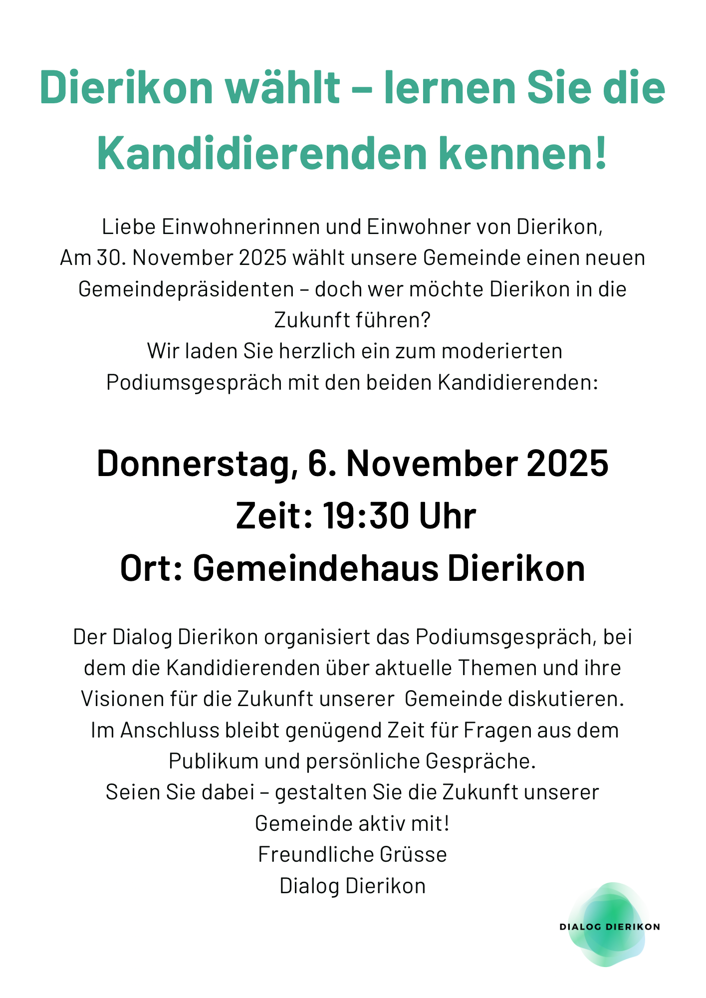 Liebe Einwohnerinnen und Einwohner von Dierikon, Am 30. November 2025 wählt unsere Gemeinde einen neuen Gemeindepräsidenten - doch wer möchte Dierikon in die Zukunft führen? Der Dialog Dierikon lädt Sie herzlich ein zum moderierten Podiumsgespräch mit den beiden Kandidierenden: